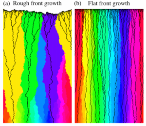 In a spatially expanding biological population, subpopulations compete for space along the propagating population front. Often this front is not smooth, but instead increasingly rough with time. For non-motile organisms, the ancestral lineage trees trace out superdiffusive random walks during the expansion, due to the front roughness. The statistical features of these “KPZ random walkers” have important implications for the population’s evolution, including the decay of genetic diversity. This work with Sherry Chu, Mehran Kardar, and David Nelson uses numerical techniques to calculate scaling laws for lineage coalescence statistics, and shows how these laws are modified by environmental heterogeneities.