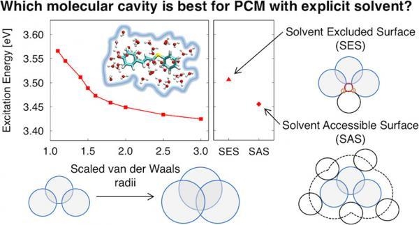 Makenzie's paper published in J. Phys. Chem. B shows how to more accurately model processes (such as electronic excitation) in solution by combining a quantum mechanical treatment of solvent molecules near to the active site with a polarizable continuum model.
