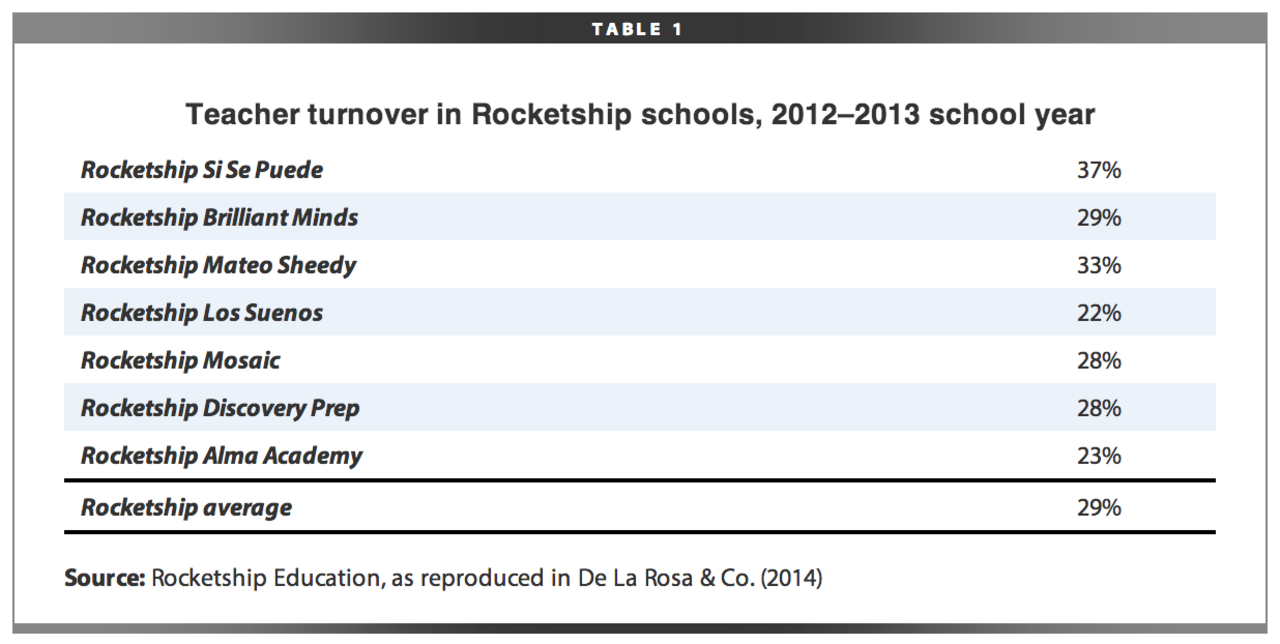 In addition to the switch from human to digital instruction, Rocketship appears to rely on an educational model that functions with an inexperienced, high-turnover teaching staff. The Rocketship school in Milwaukee pays Teach for America (TFA) $52,000 per year to serve as a steady source of beginner teachers (Rocketship Education 2011, Attachment G), and nationwide 75 percent of the company’s teachers are either current fellows or recent graduates of TFA (Merrow 2012). TFA is not designed to produce career teachers. Indeed, part of its recruitment message to college graduates is that the program will make them competitive for graduate school or corporate employment after their two years in the classroom (Teach for America 2014).5 A company that relies on TFA to supply its teachers must plan on a high degree of turnover; that is part of how TFA is supposed to work. Unsurprisingly, then, on average almost 30 percent of Rocketship teachers leave every year, as shown in Table 1—a rate more than twice as high as in the Milwaukee school district (De La Rosa & Co. 2014, B-22; Richards and Crowe 2013).