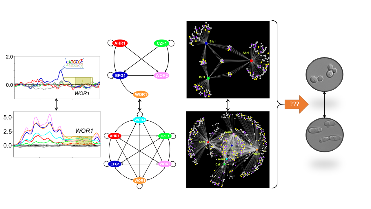 Cell fate decisions, and the subsequent maintenance of unique cellular identities, represent essential processes in the development of multicellular organisms. Similar cell fate decisions play critical roles in the adaptation of unicellular microbes to distinct environmental niches, including during commensal and pathogenic growth within mammalian hosts. The white-opaque phenotypic switch in Candida albicans represents a unique model system for understanding epigenetic heritability in a relatively simple eukaryotic microbe. This switch controls stochastic differentiation between two distinct cell types, each of which is heritably maintained for hundreds of generations. Essentially this switch generates two distinct pathogenic cell types from the same genome. The Hernday lab is focused on utilizing this switch as a model system for developing a detailed, comprehensive, predictive model of the logic and dynamics of a heritable yet reversible transcriptional program in eukaryotes. This model system presents many unique advantages relative to higher eukaryotes, including a small genome size, facile molecular genetics and biochemistry, and the prior identification of all known or predicted transcription factors that are involved in regulating this switch; a similar switch is not found in traditional model yeasts. In addition to gaining insight into the inner workings of complex heritable transcriptional programs, we also aim to develop stable yet reversible engineered transcriptional programs for applied synthetic biology.