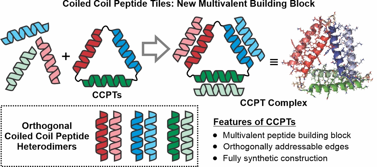 A major project goal within our lab is to expand the de novo protein/peptide assembly space through leveraging the full arsenal of peptide, protein, and bioconjugation chemistry to create fully synthetic protein-mimetic structures. In this thrust, we aim to establish a new class of cyclic peptide tiles that employ programmable and orthogonal coiled coil-based interactions to drive their controlled self-assembly into higher dimensional protein-based architectures.