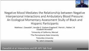 Zawadzki, M. J. Graham-Engeland, J. E., Robles, P. L., & Brondolo, E. (2020, December 3-4). Negative mood mediates the relationship between negative interpersonal interactions and ambulatory blood pressure: An ecological momentary assessment study of Black and Hispanic participants [Poster presentation]. American Psychosomatic Society Virtual Meeting. https://psychosomatic.org/wp-content/uploads/2020/11/APS-Schedule-1.pdf