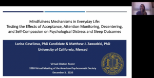 Gavrilova, L. G., & Zawadzki, M. J. (2020, December 3-4). Mindfulness mechanisms in everyday life: Testing the effects of acceptance, attention monitoring, decentering, and self-compassion on psychological distress and sleep outcomes [Poster presentation]. American Psychosomatic Society Virtual Meeting. https://psychosomatic.org/wp-content/uploads/2020/11/APS-Schedule-1.pdf
