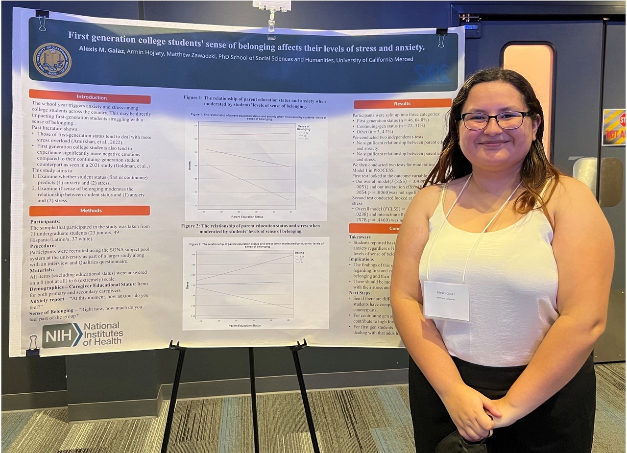 Galaz, A., Hojjaty, A., & Zawadzki, M. J. (2022, August 5). First generation college students’ sense of belonging affects their levels of stress and anxiety [Poster presentation]. UROC Annual Undergraduate Research Symposium, University of California, Merced.