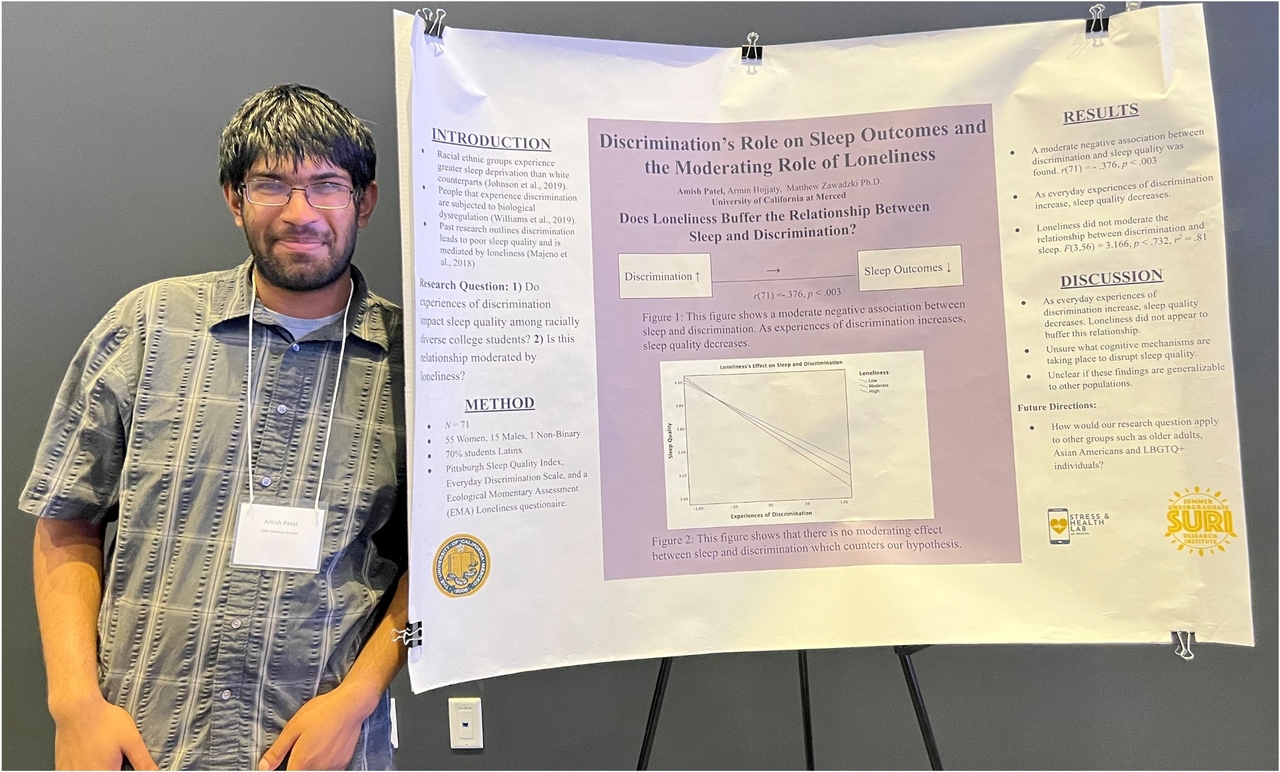 Patel, A., Hojjaty, A., & Zawadzki, M. J. (2022, August 5). Discrimination’s role on sleep outcomes and the moderating role of loneliness [Poster presentation]. UROC Annual Undergraduate Research Symposium, University of California, Merced.