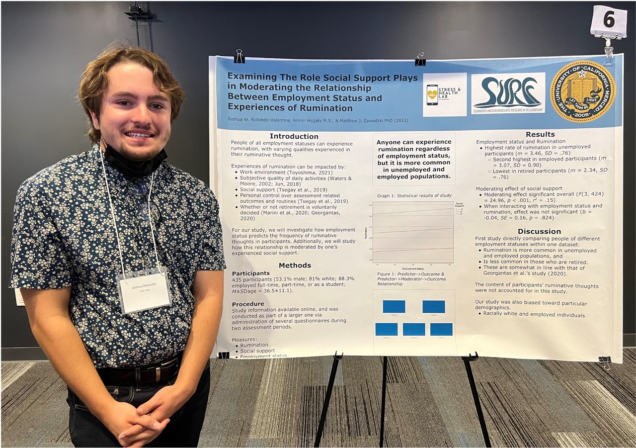 Rotondo-Valentine, J. W., Hojjaty, A., & Zawadzki, M. J. (2022, August 5). Examining the role social support plays in moderating the relationship between employment status and experiences of rumination [Poster presentation]. UROC Annual Undergraduate Research Symposium, University of California, Merced.