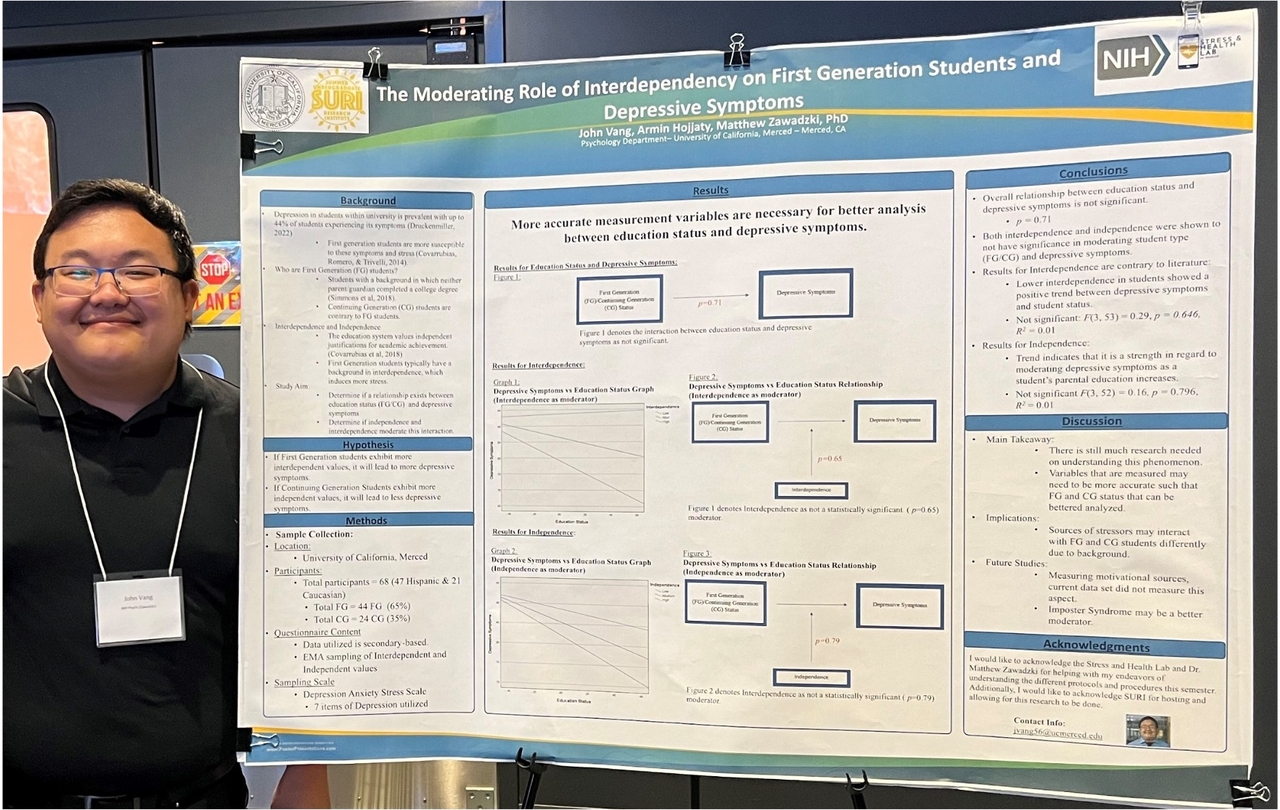 Vang, J., Hojjaty, A., & Zawadzki, M. J. (2022, August 5). The moderating role of the interdependency of first generation students and depressive symptoms [Poster presentation]. UROC Annual Undergraduate Research Symposium, University of California, Merced.