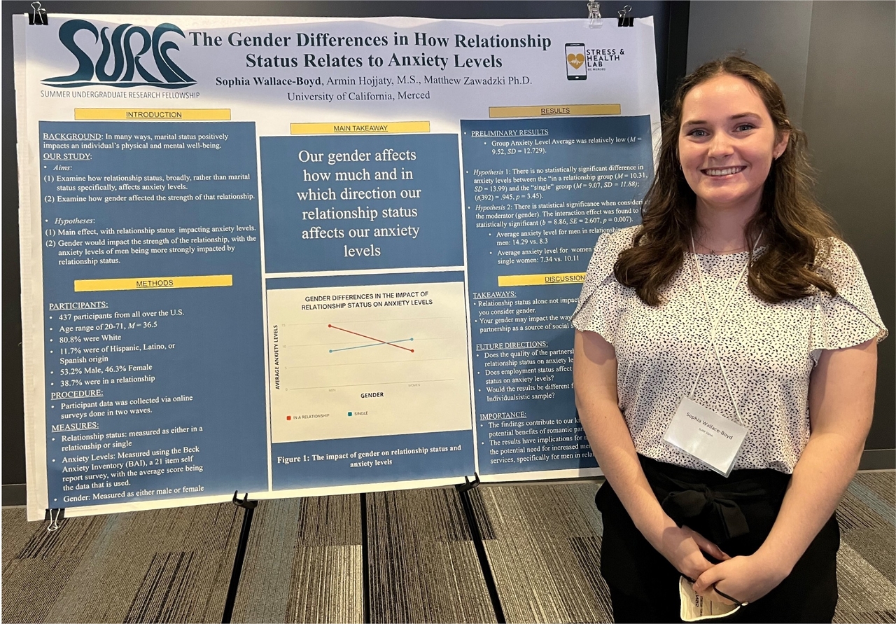Wallace-Boyd, S., Hojjaty, A., & Zawadzki, M. J. (2022, August 5). The gender differences in how relationship status relates to anxiety levels [Poster presentation]. UROC Annual Undergraduate Research Symposium, University of California, Merced.