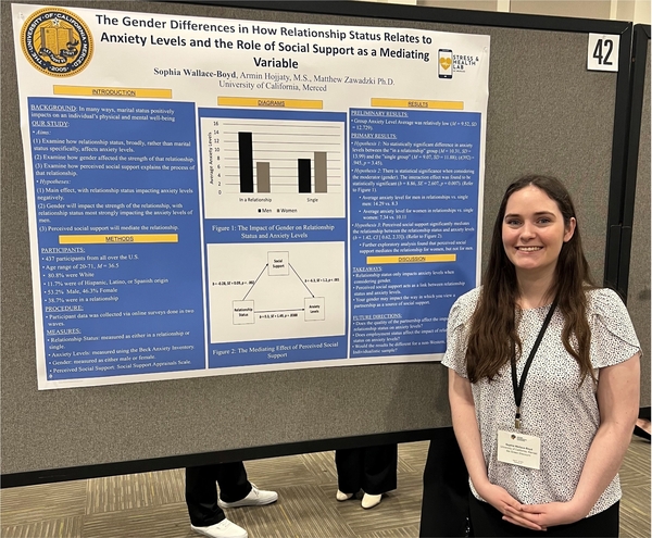Wallace-Boyd, S., Hojjaty, A., & Zawadzki, M. J. (2023, April 27-30). The gender differences in how relationship status relates to anxiety levels and the role of social support as a mediating variable [Poster presentation]. Western Psychological Association Annual Meeting, Riverside, CA, USA.