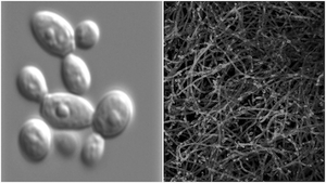The planktonic form of Candida albicans (left) versus the biofilm form of Candida albicans (right).
