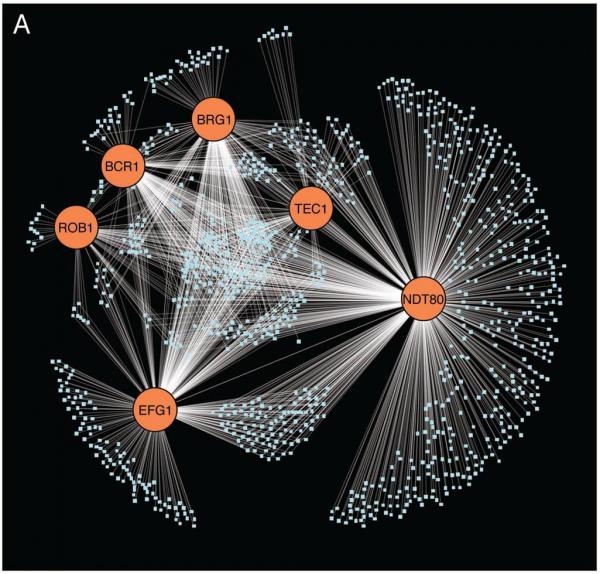 C. albicans forms biofilms, structured community of cells that adhere to a surface and are surrounded by a self-produced extracellular matrix, on both biotic and abiotic surfaces. Additionally, these biofilms are highly resistant to antifungal drugs and other chemical, and physical stresses. The robustness of C. albicans biofilms make them especially hard to combat and underline the importance of further research in this field. The development of C. albicans biofilms is a complex process and we are interested in understanding the genetic pathway that controls it. We recently identified the transcriptional network that orchestrates the development of C. albicans biofilms. This network consists of six master transcription regulators (Efg1, Tec1, Bcr1, Ndt80, Rob1 and Brg1) and approximately 1,000 target genes, whose expression is controlled by these regulators.
